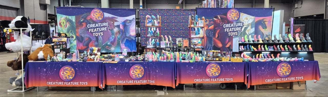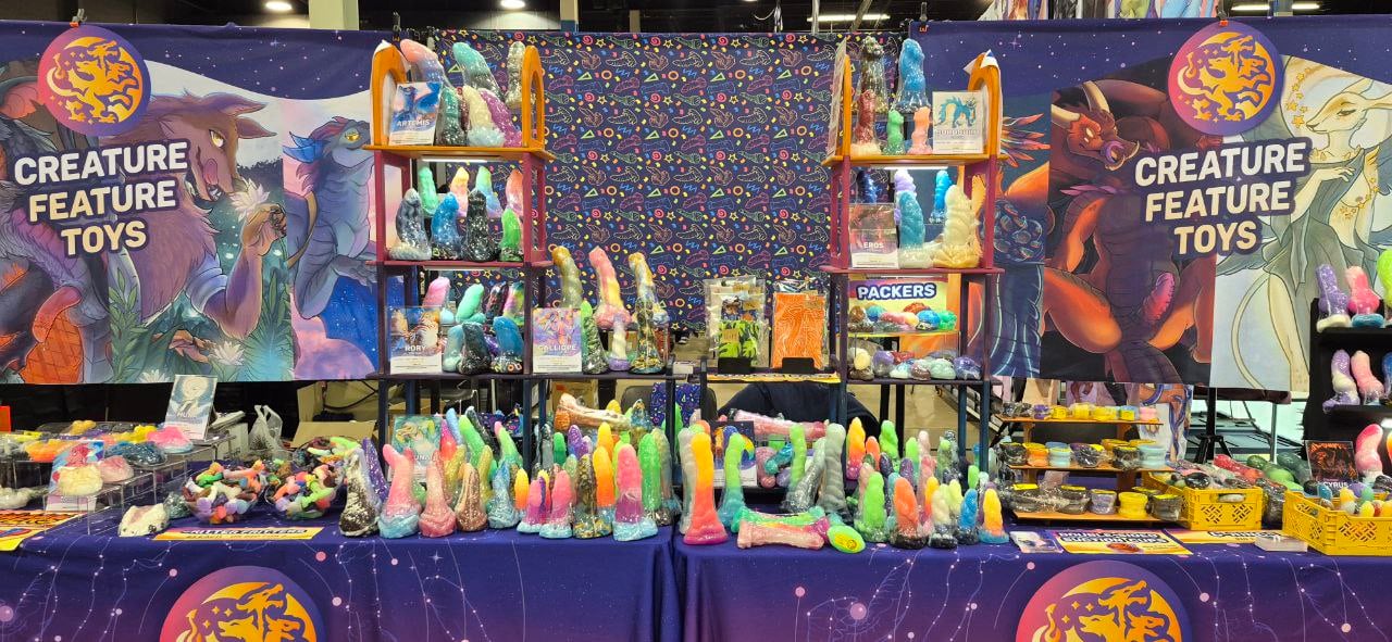 Our booths aim to provide a fun browsing experience where people feel comfortable picking up toys and asking any questions they might have. In-person shopping experiences are special and where a lot of folks work up the courage to figure out what they want for their first toy, or find their next exciting toy type, so its important to us that we offer variety and make our table shoppable!